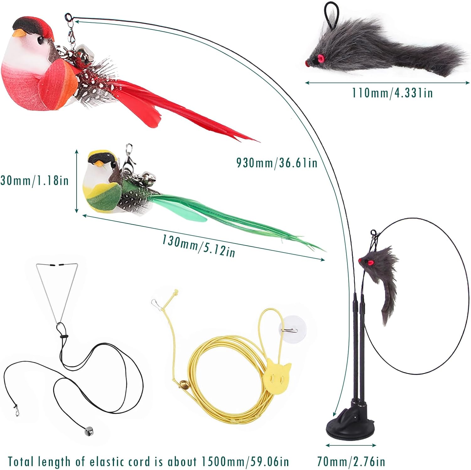 - Excellent Interactive Cat Toys: This Retractable Cat Teaser Wand Toy Set includes a double rod suction cup wand and 10 different style feather toy refills, which consist of a gray mouse, a colorful mouse, a triangle hook, an elastic rope, two caterpillars, two feathers, and two birds. It also comes with a delicate bell to attract the cat's attention and help alleviate boredom
