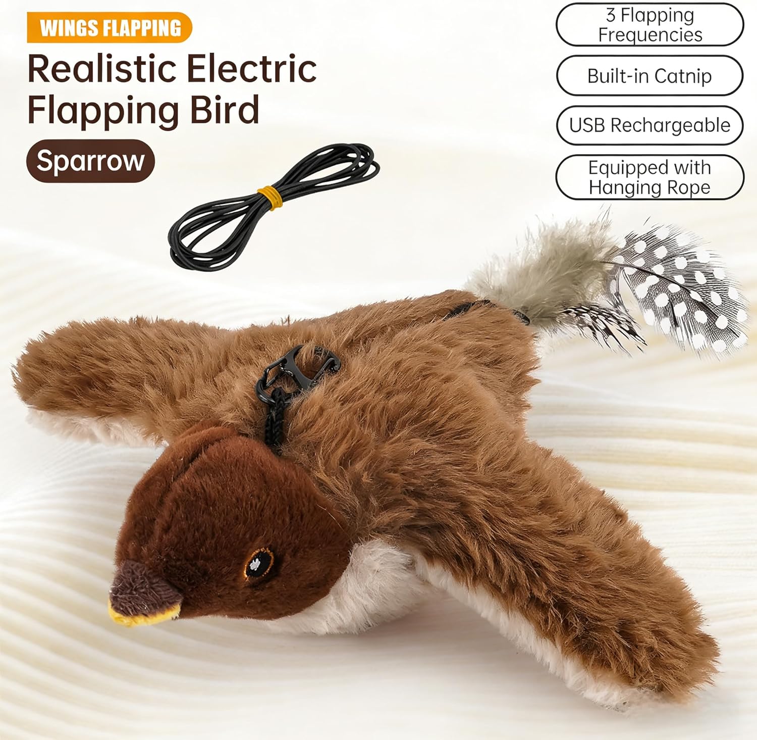 - 1. Interactive Flying Bird Toy for Indoor Cats Designed to mimic a real sparrow, this flying bird cat toy features flapping wings and chirping sounds that instantly capture your cat’s hunting instincts. Ideal for indoor cats needing stimulation and exercise.